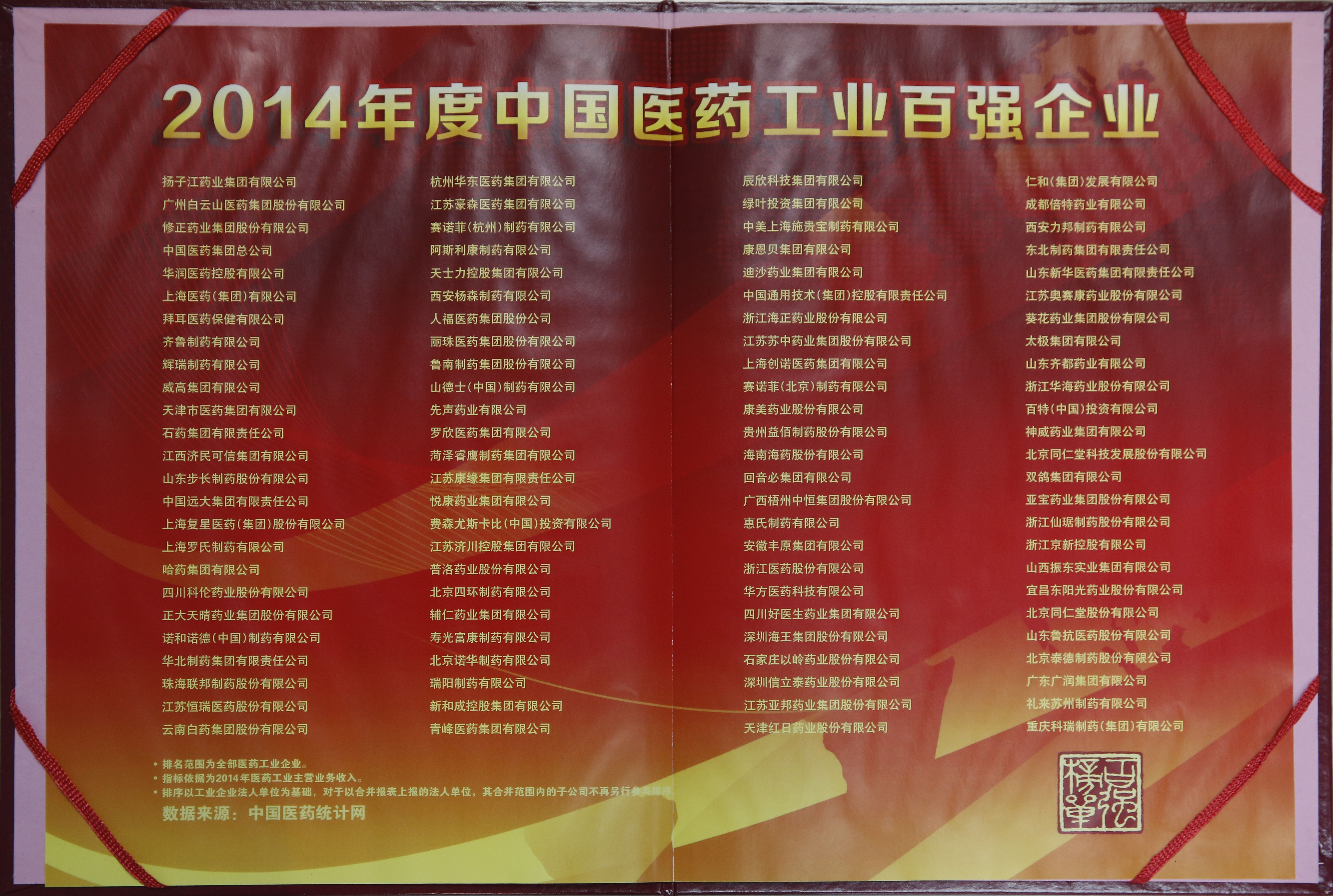 榮獲2014年度中國(guó)醫(yī)藥工業(yè)百?gòu)?qiáng)企業(yè)稱(chēng)號(hào)